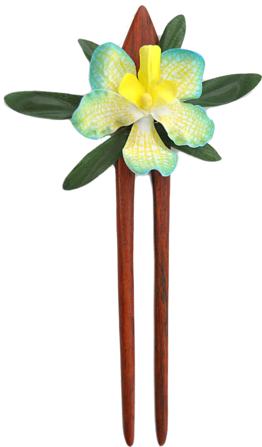 Lieferumfang: 1 Stück Tolle Tiki Haarnadel mit Orchideen Blüte und Palmenblättern Aufwendige Verarbeitung Sehr selten!!! Haarnadel - kann in Form und Farbe abweichen, da Handarbeit Dunkelgrüne Blätter