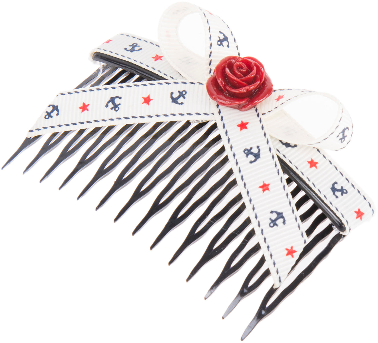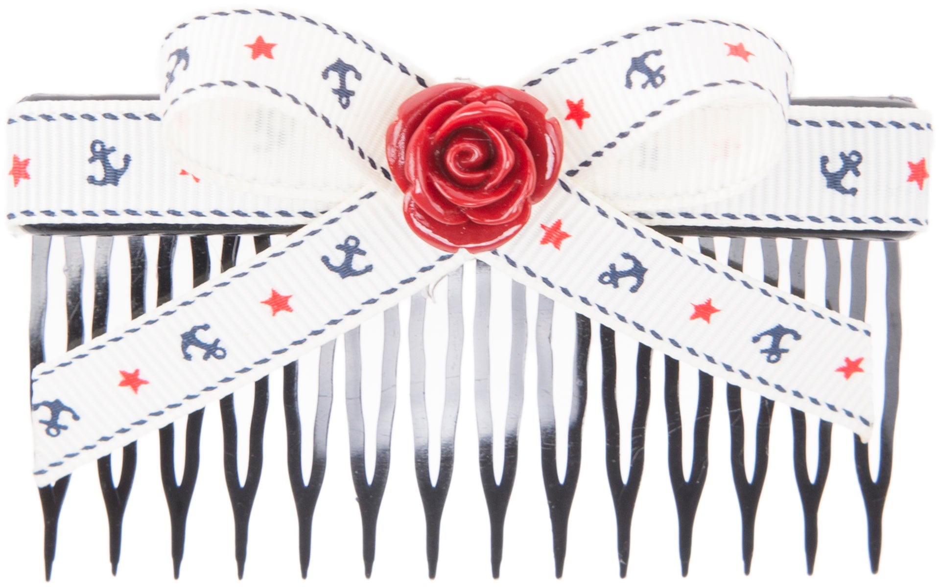 Süßer Sailor Haarkamm mit liebevollen Details Am oberen Rand mit weißer Borte mit dunkelblauen Ankern und roten Sternchen Mittige Schleife (5cm x 4cm) In der Schleifenmitte mit dunkelroter Rose Schwarzer Haarkamm In liebevoller Handarbeit gefertigt