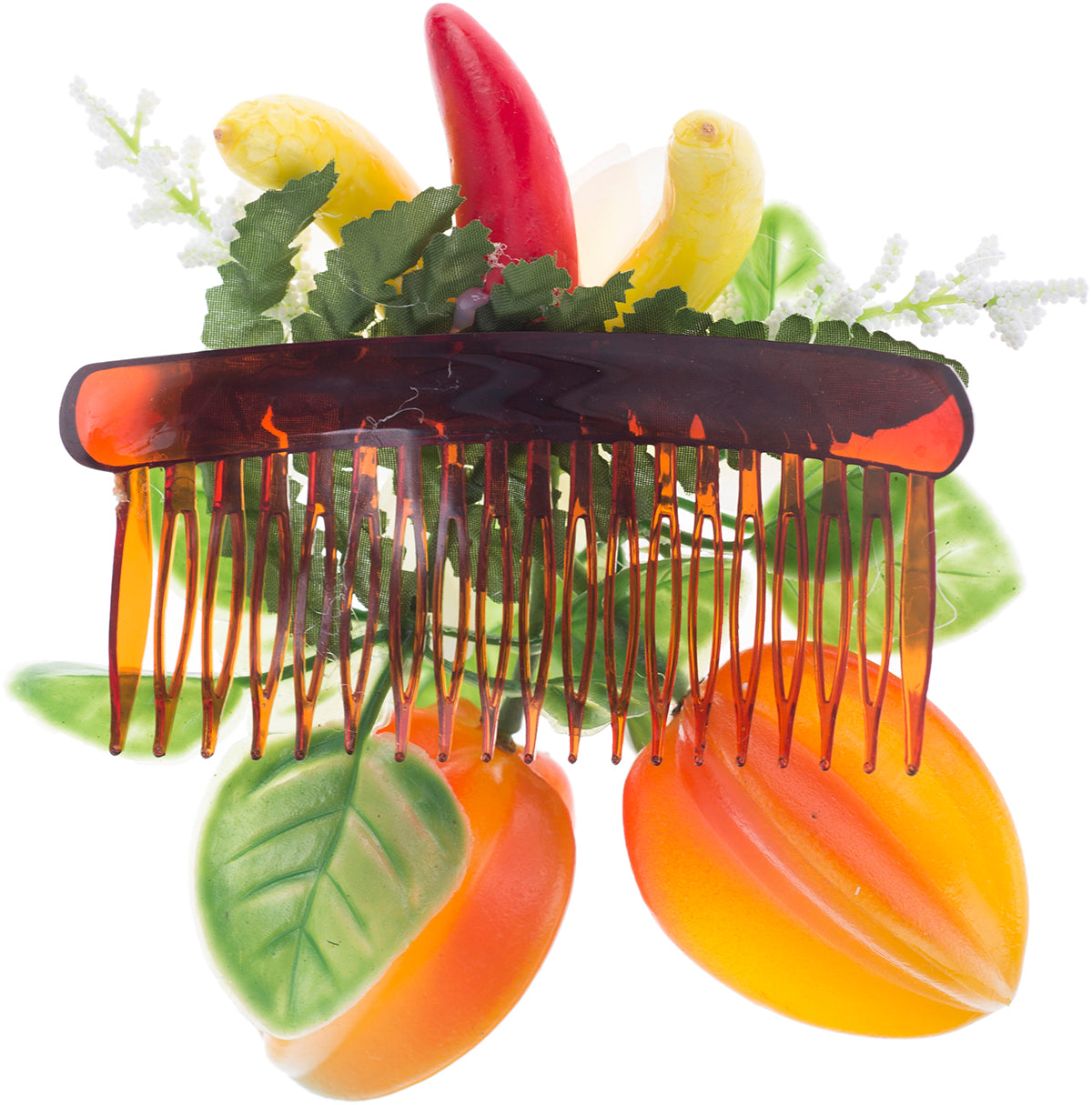 Süßer Haarkamm in transparentem Braun Besetzt mit einer Textilblüte, Blumenblättern, zwei Bananen und einer Chili Zwei Sternfrüchte aus Kunststoff hängen unter der Blüte
