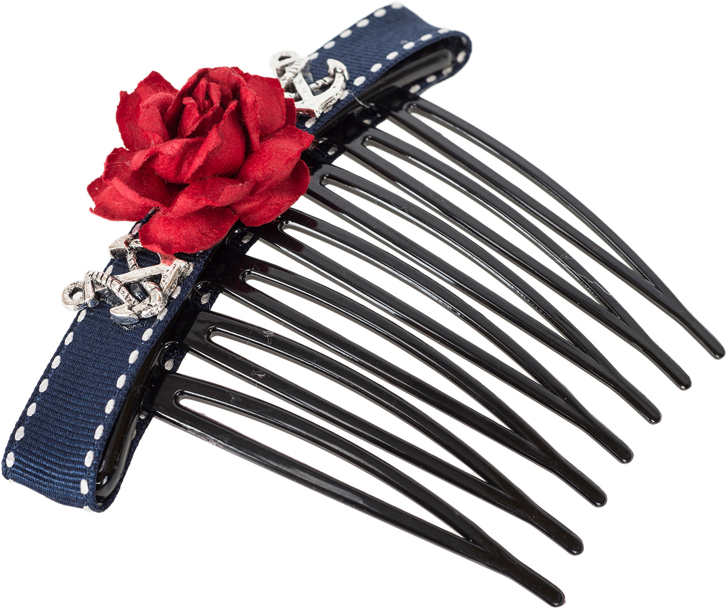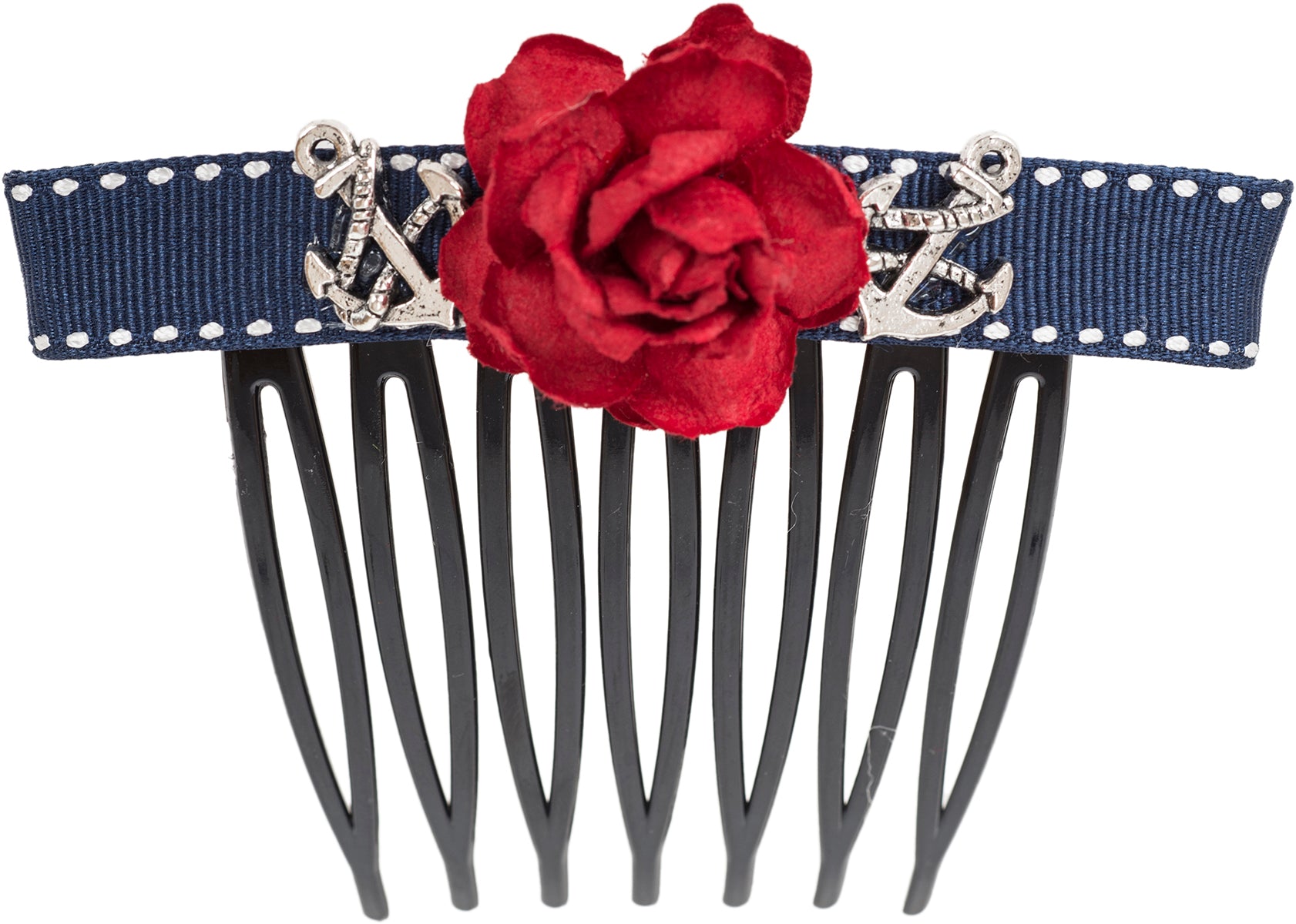 Süßer Sailor Haarkamm mit liebevollen Details Längs mit navyblau/ weisser Borte besetzt Darauf mittig mit roter, handgefertigter Papier Rose Neben der Rose jeweils ein silberfarbener Anker Schwarzer Haarkamm In liebevoller Handarbeit gefertigt