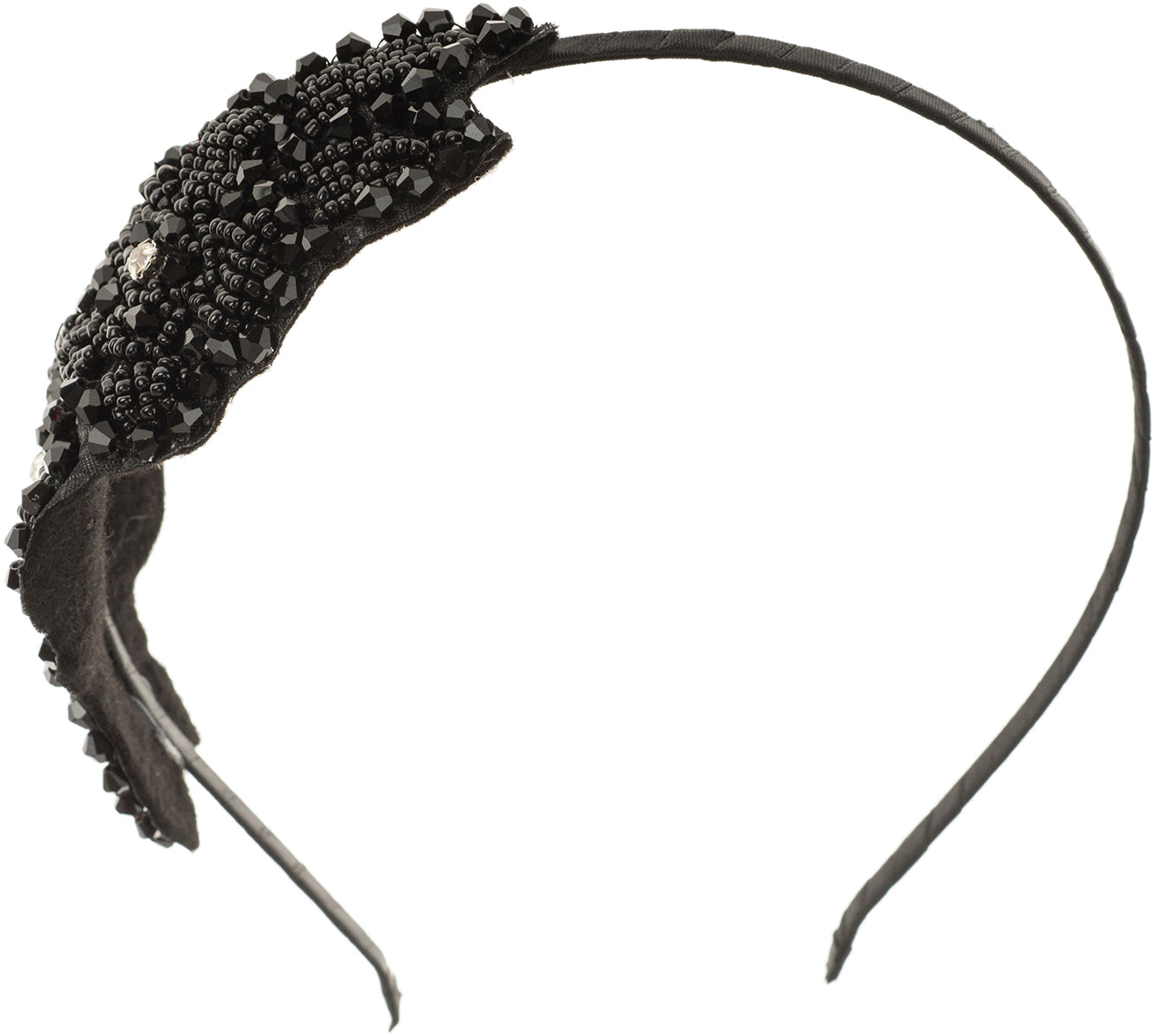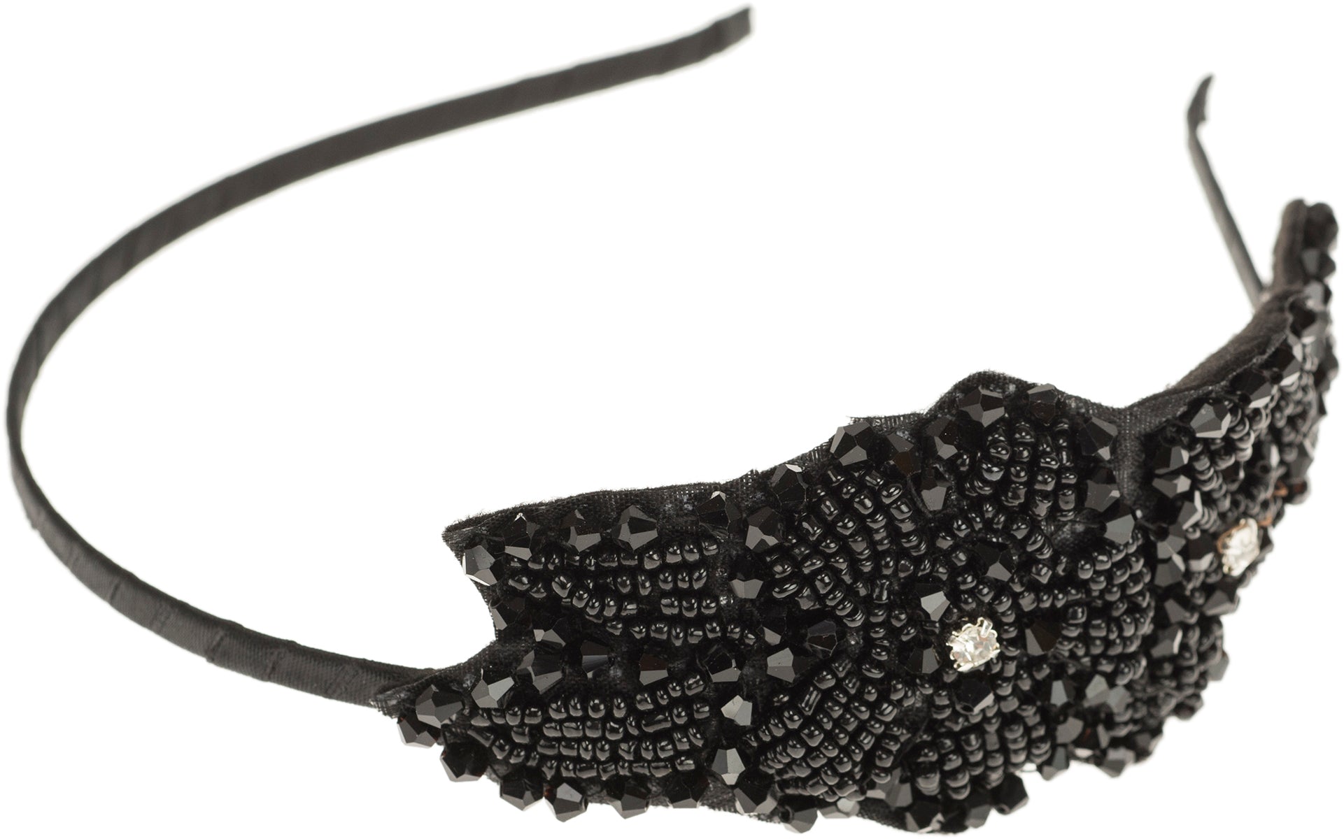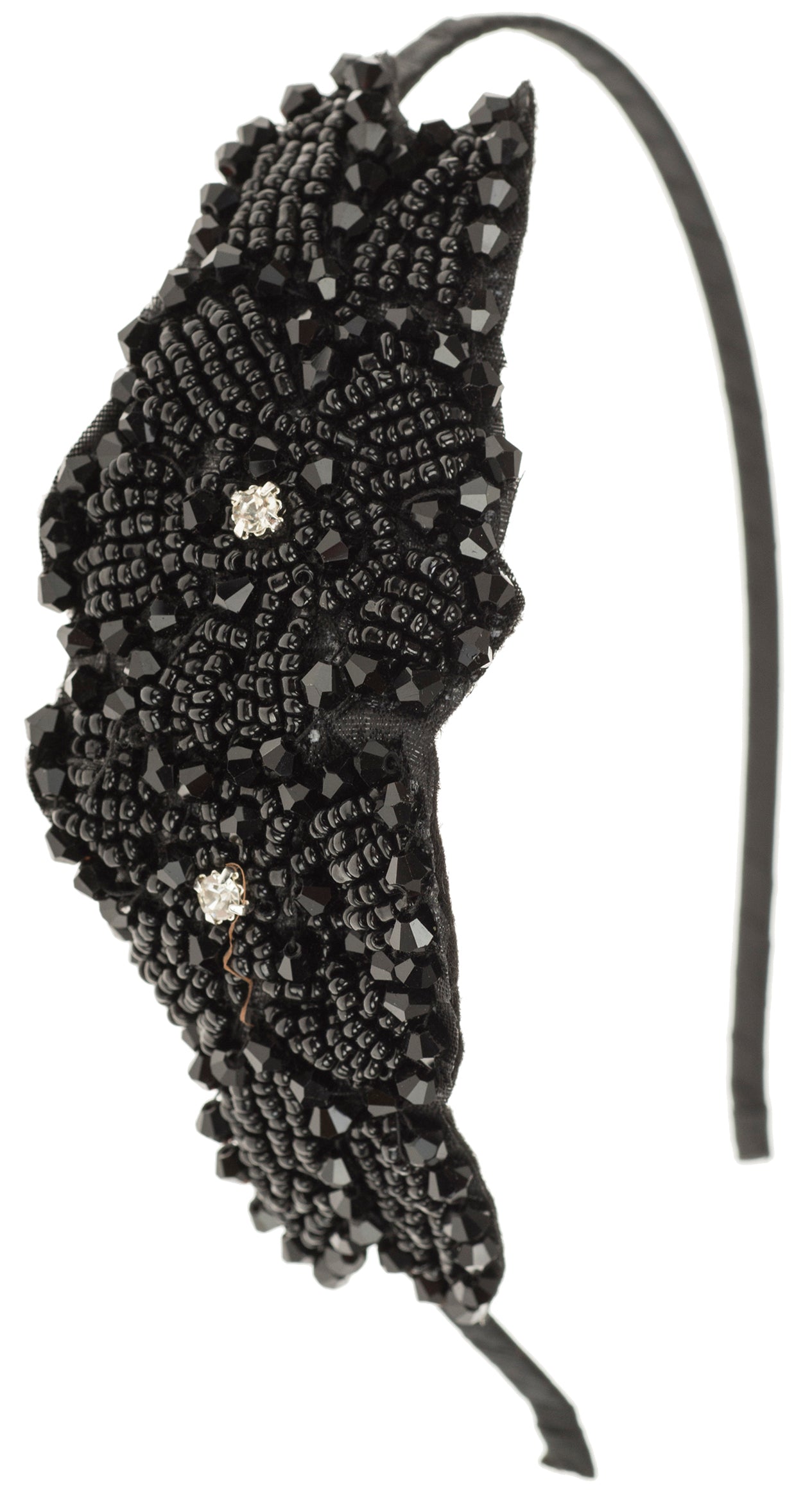 Schmaler, stoffüberzogener Haarreif in Schwarz Besetzt mit schwarzen Kunststoffperlen in verschiedenen Formen Perlenapplikation in Form von zwei Blüten mit Blättern Mittig der Blüten jeweils ein Strasssteinchen Liefermenge: 1 Stück