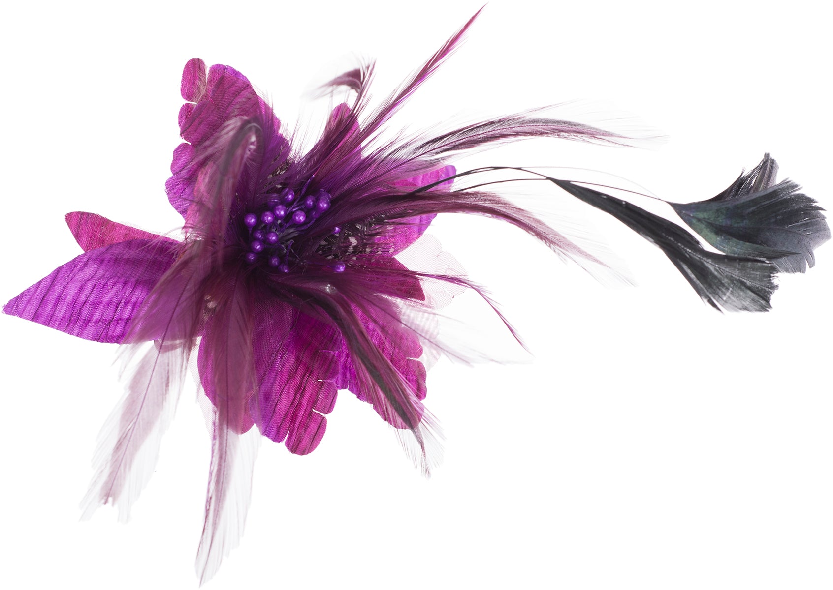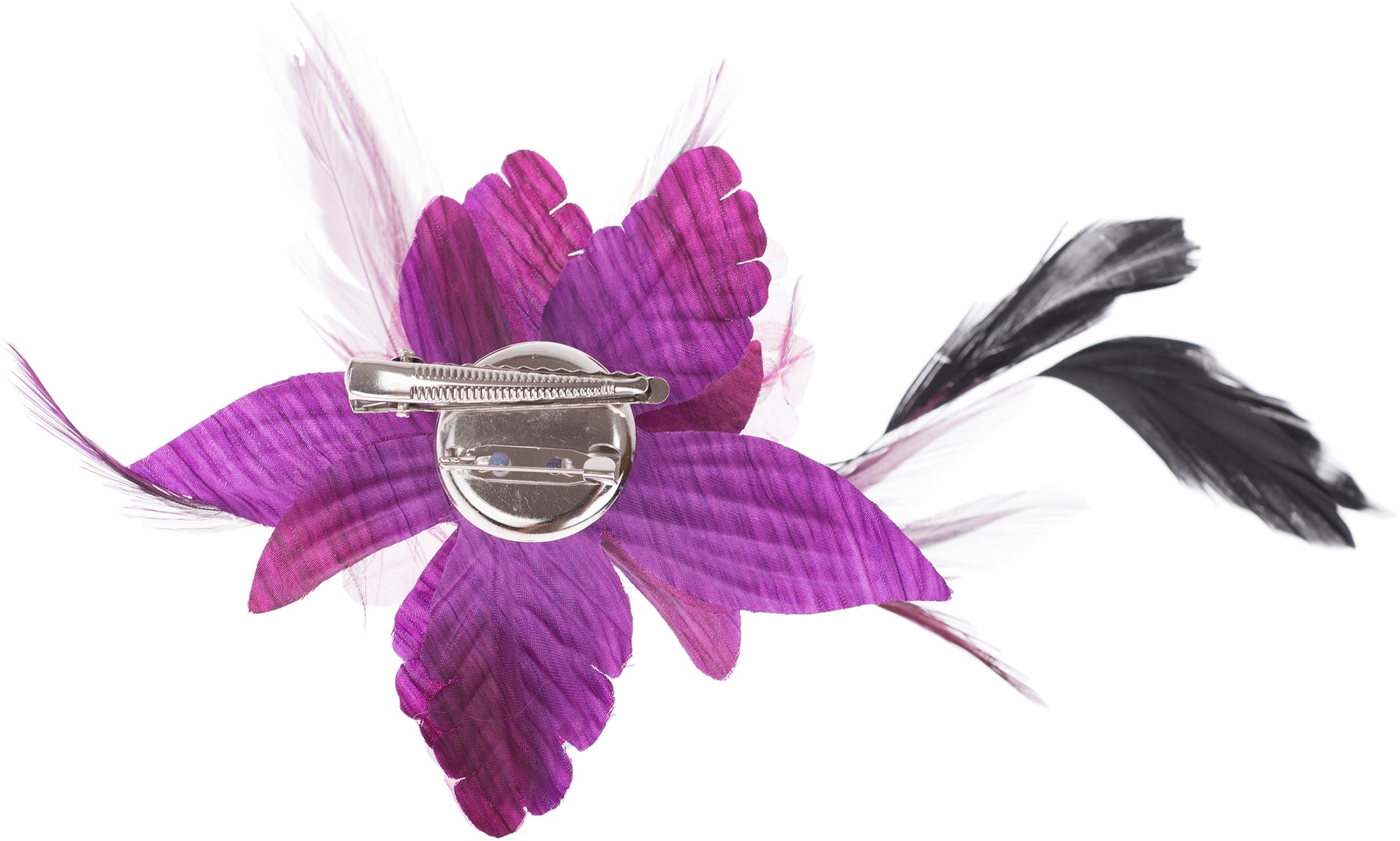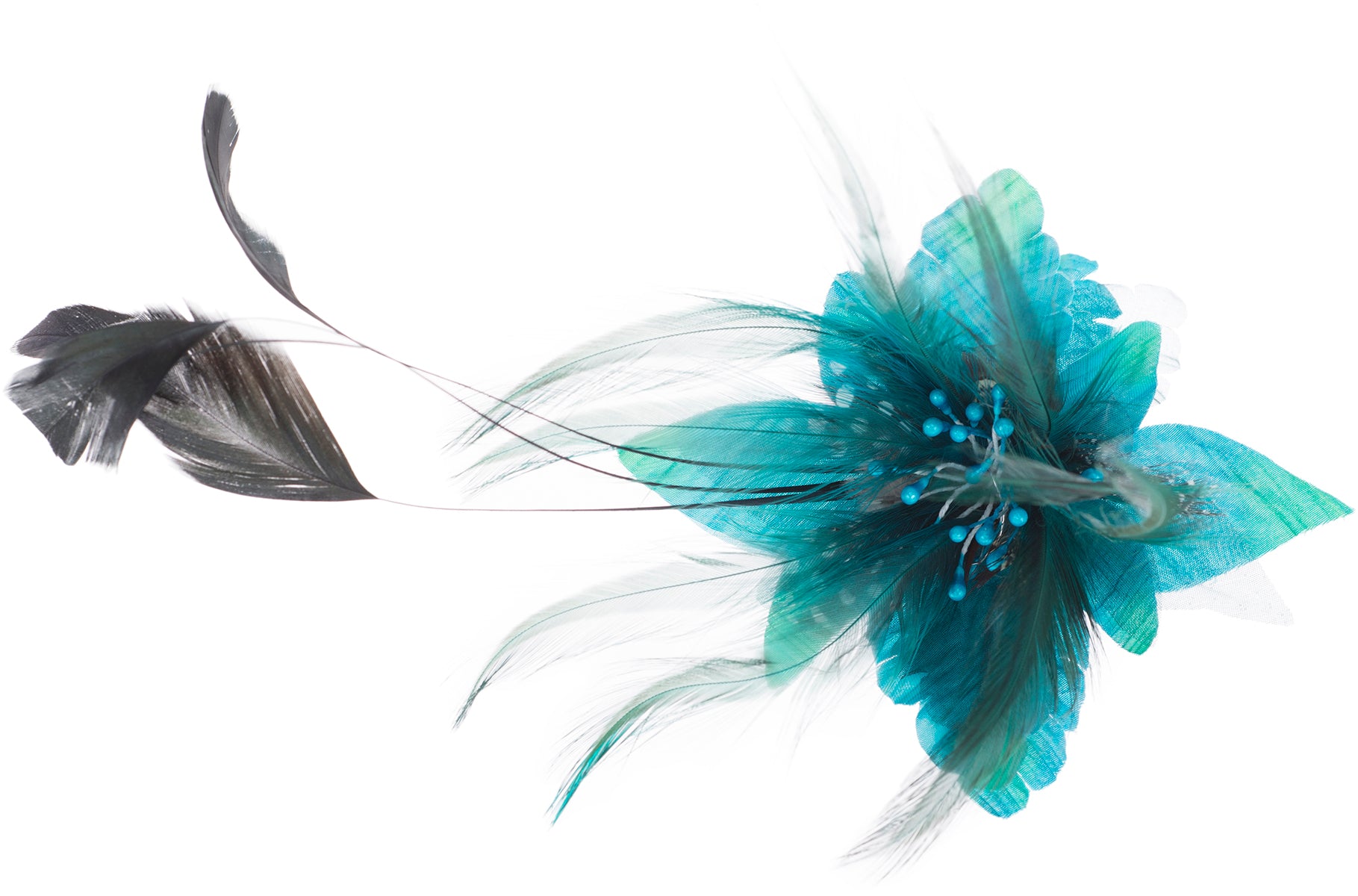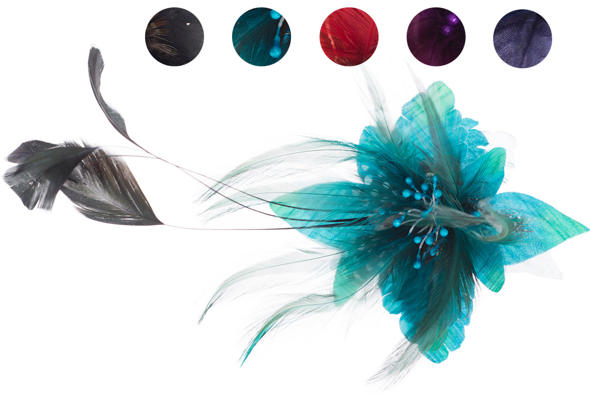 Wunderschöne, aufwendig gearbeitete Brosche Wahlweise in Schwarz, Lila, Rot oder Türkisblau Große Textilblüte mit verschiedenen Federn Mittig verziert mit Perlenköpfchen als Blütenstengel Kann als Haarspange oder Brosche verwendet werden