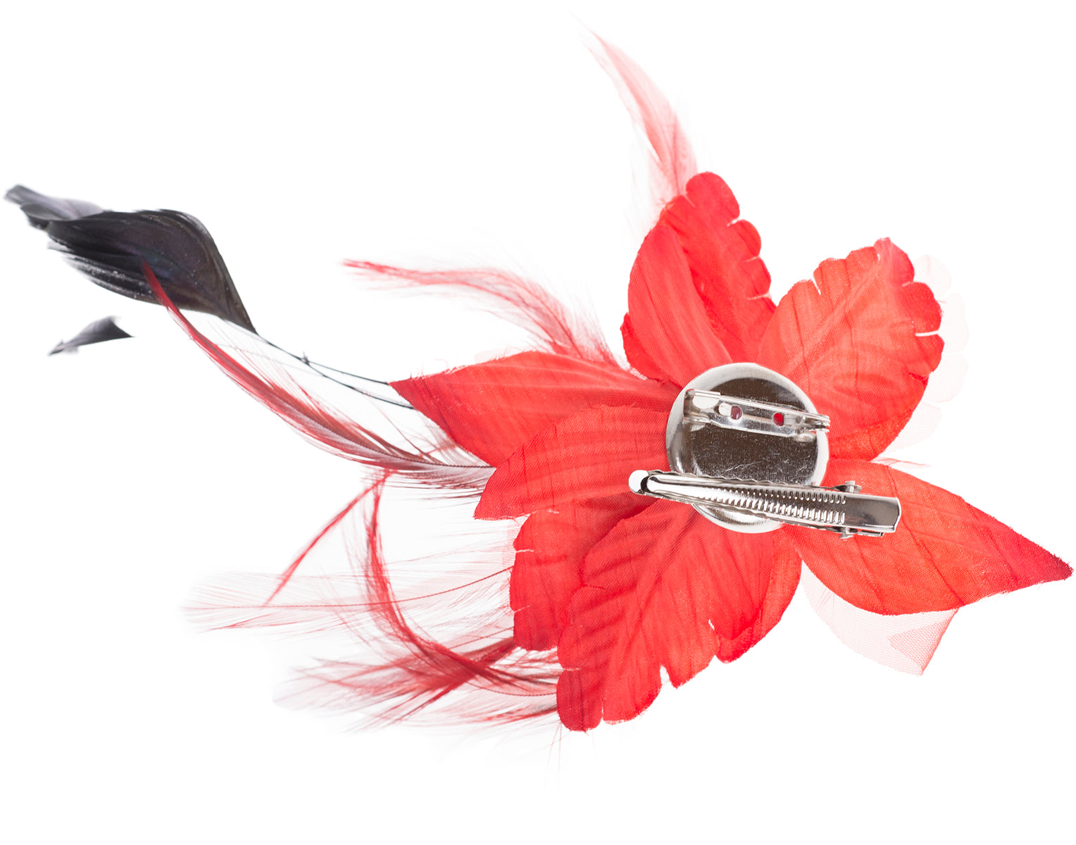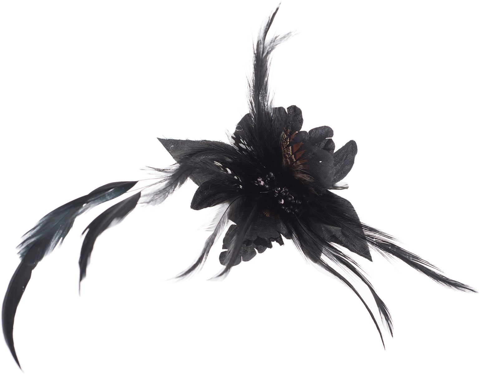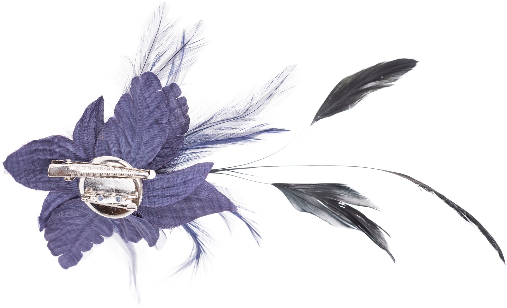 Wunderschöne, aufwendig gearbeitete Brosche Wahlweise in Schwarz, Lila, Rot oder Türkisblau Große Textilblüte mit verschiedenen Federn Mittig verziert mit Perlenköpfchen als Blütenstengel Kann als Haarspange oder Brosche verwendet werden