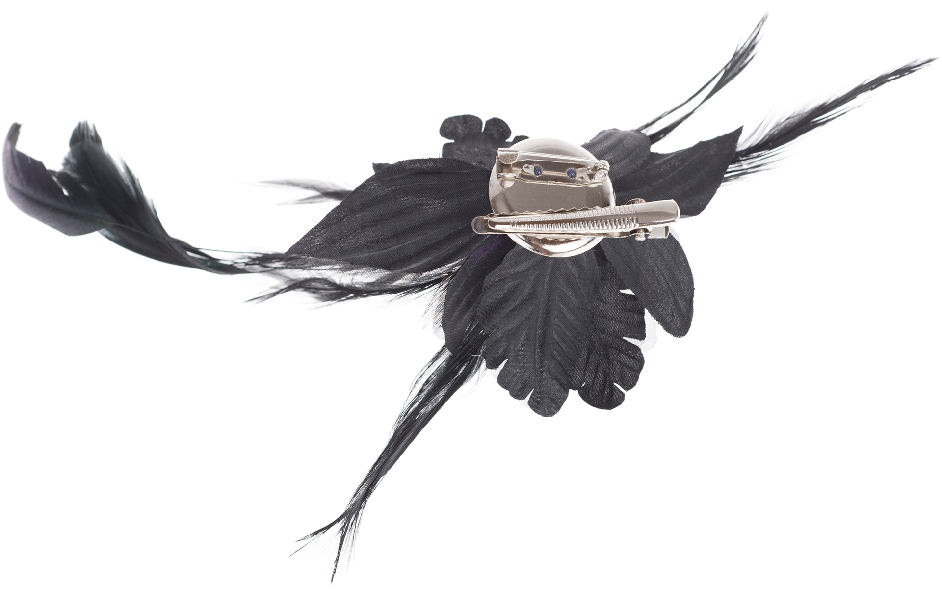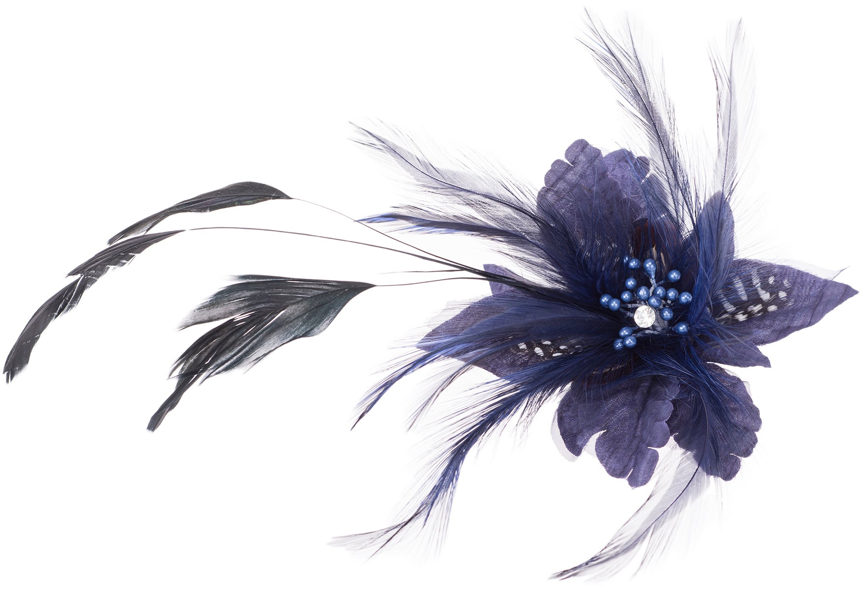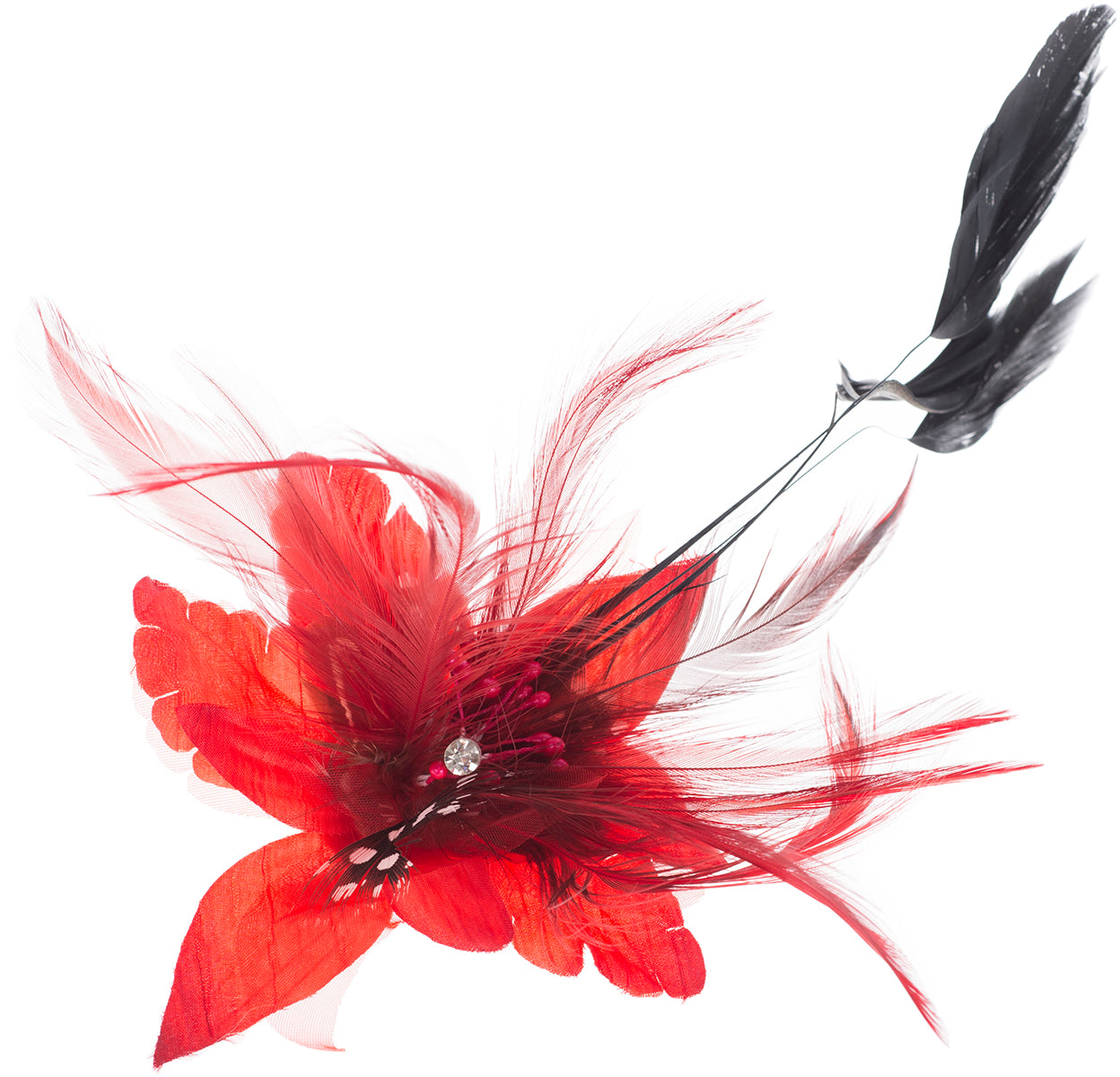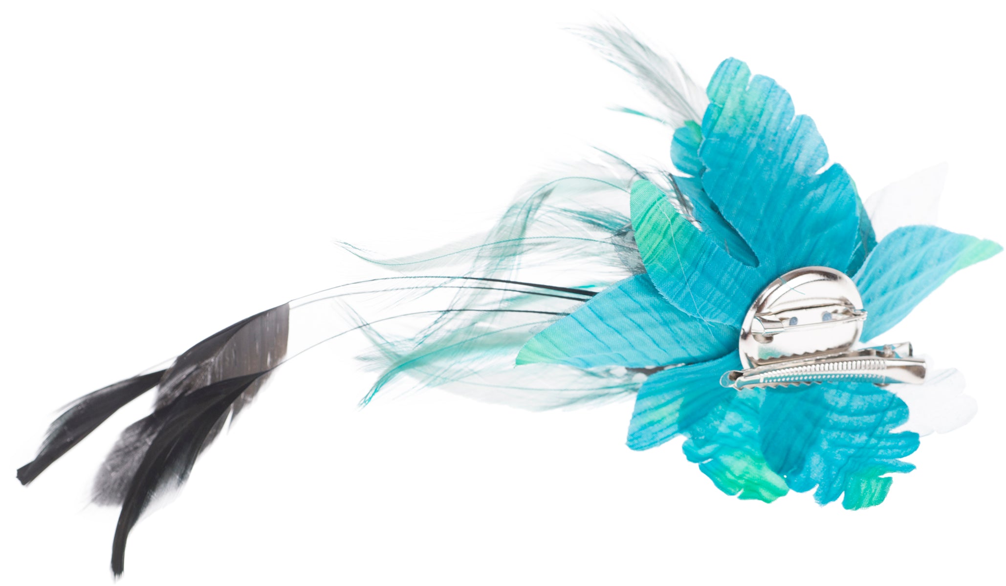 Wunderschöne, aufwendig gearbeitete Brosche Wahlweise in Schwarz, Lila, Rot oder Türkisblau Große Textilblüte mit verschiedenen Federn Mittig verziert mit Perlenköpfchen als Blütenstengel Kann als Haarspange oder Brosche verwendet werden