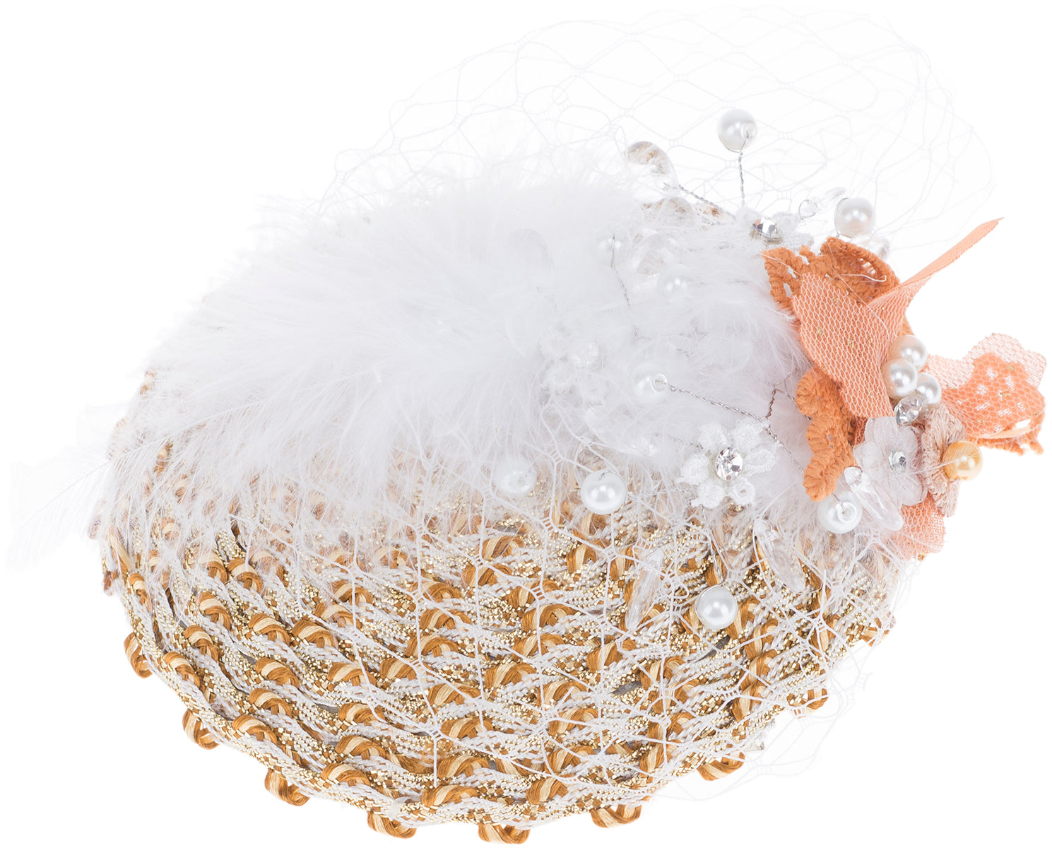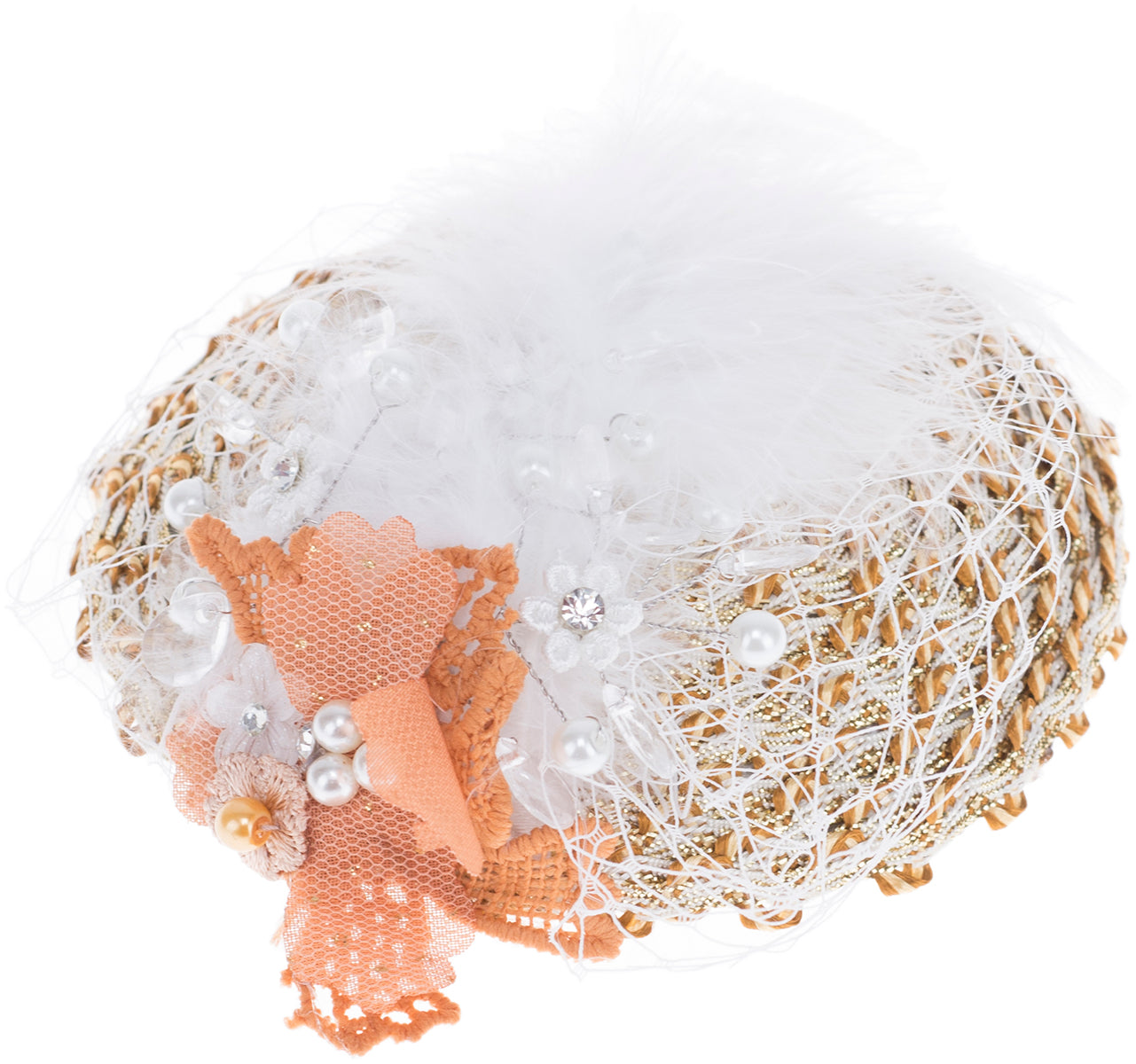 Besetzt mit weißen Federn und reichlich geschmückt mit Kunststoffperlen