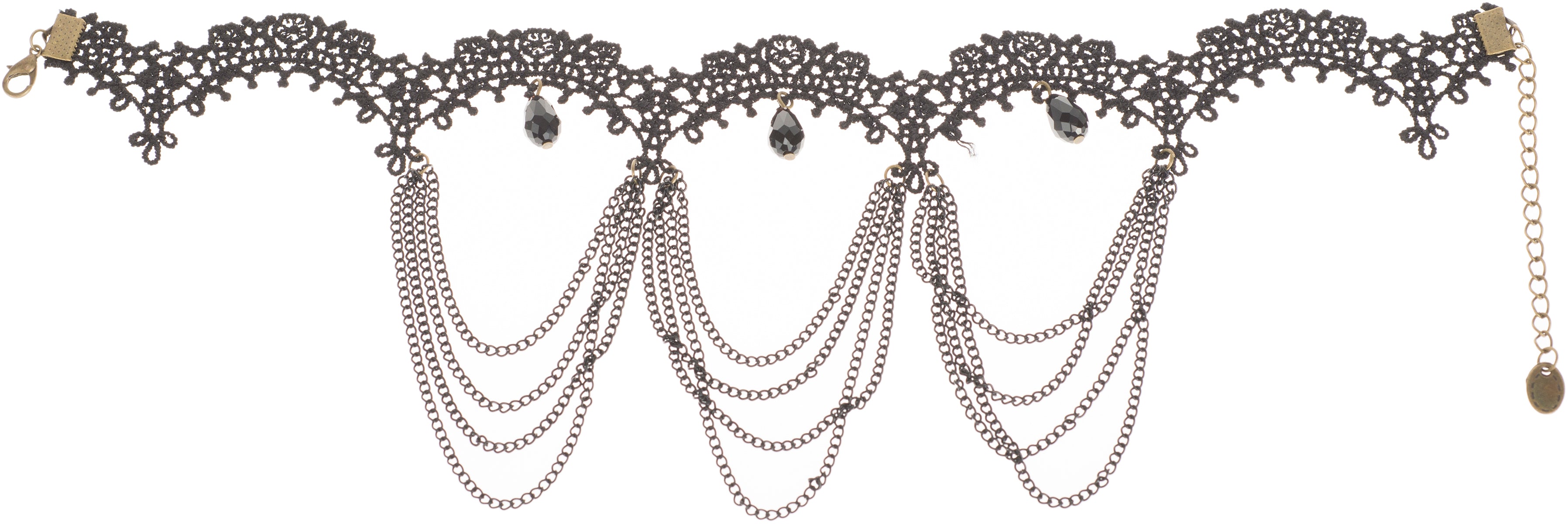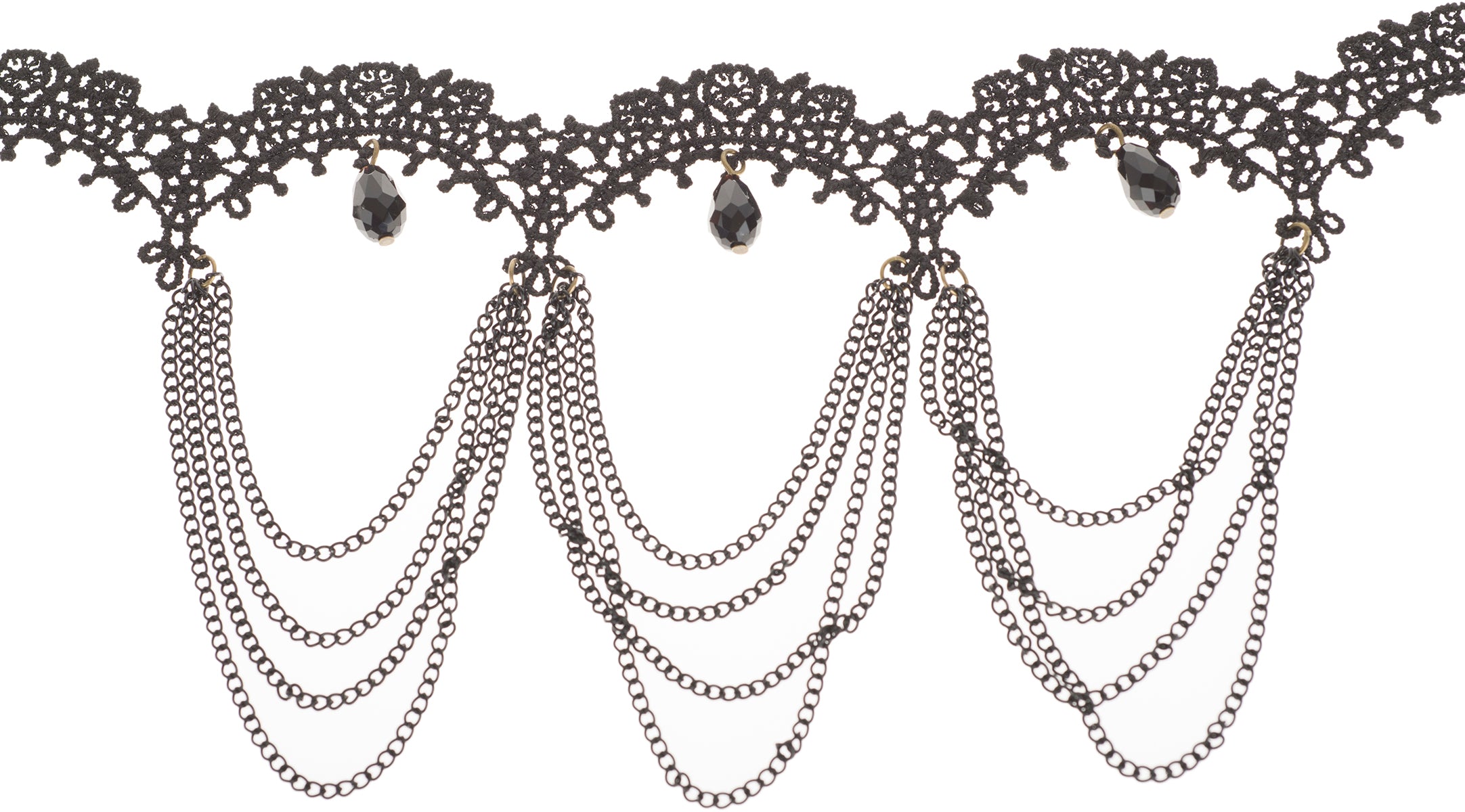 Edler Choker / Halsband in Schwarz Ca. 31cm langes Band aus Häkelspitze Enden mit altgoldfarbener Metalleinfassung und -verschluss Vorne mit schwarzen Perlen und Kettchen in Bögen, die herabhängen Größenverstellbar von 32cm - 40cm