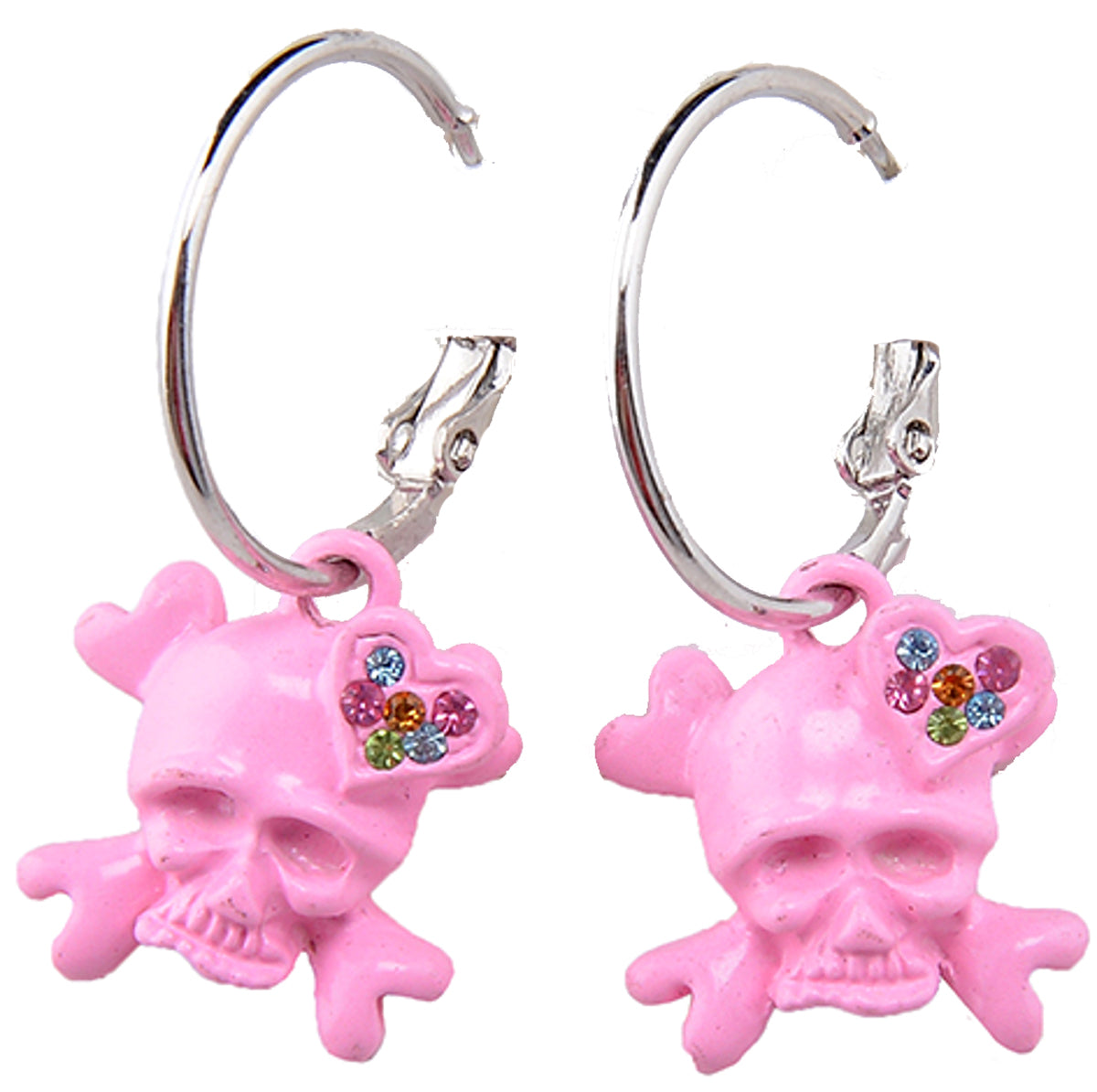 Silberfarbene Creolen Pinker Anhänger in Form eines Skulls Besetzt mit seitlichem Herzchen, mit bunten Strass-Steinen verziert Sehr schöne Verarbeitung Liefermenge: 1 Paar