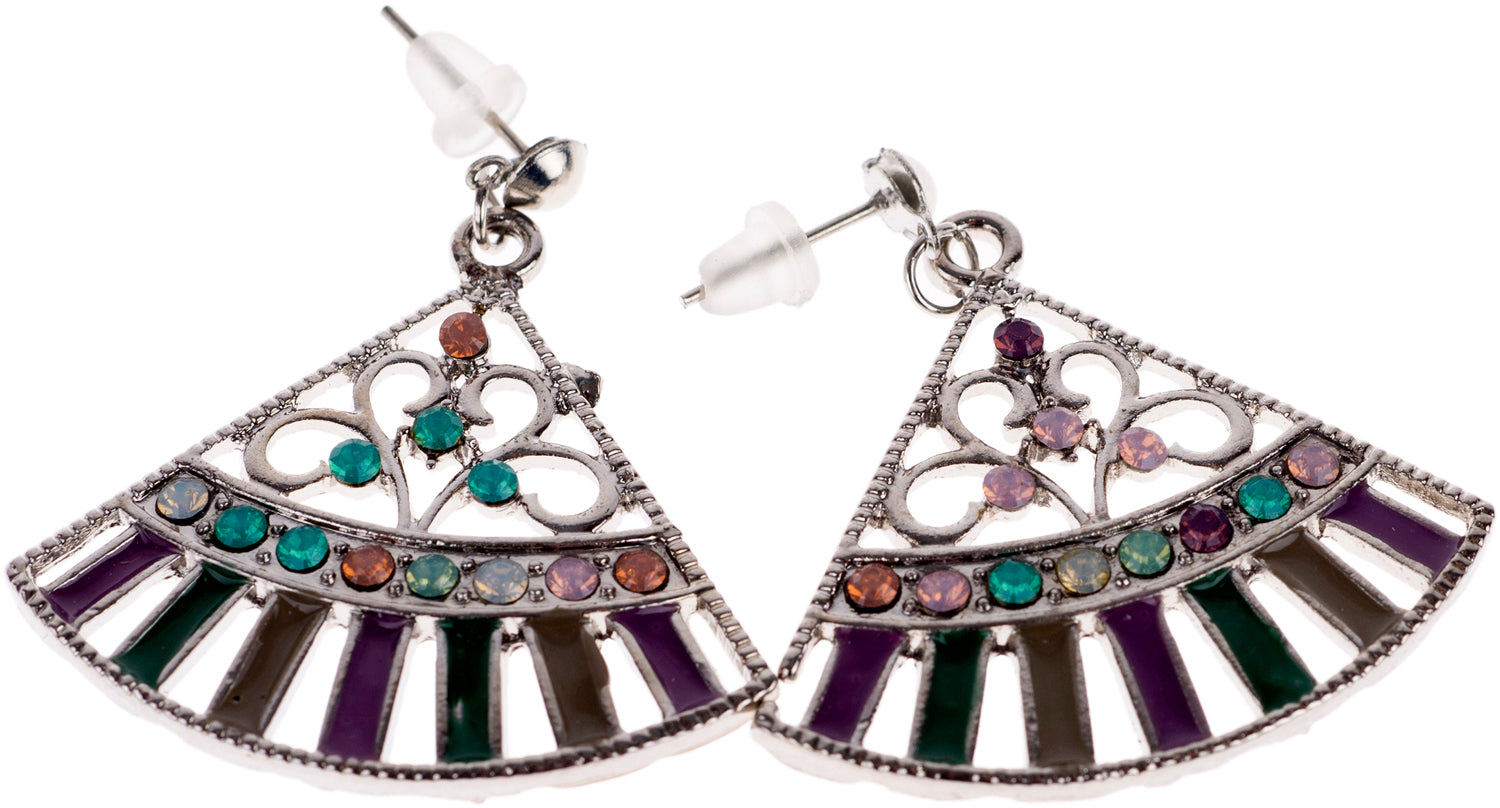 Die detailreichen Ohrhänger sind das perfekte Accessoire für ein authentisches Vintage Outfit! Altsilberfarbene Retro Ohrstecker Boho angehauchte Anhänger in Fächerform besetzt mit vielen bunten Steinchen Mit bunter Lasur Liefermenge: 1 Paar