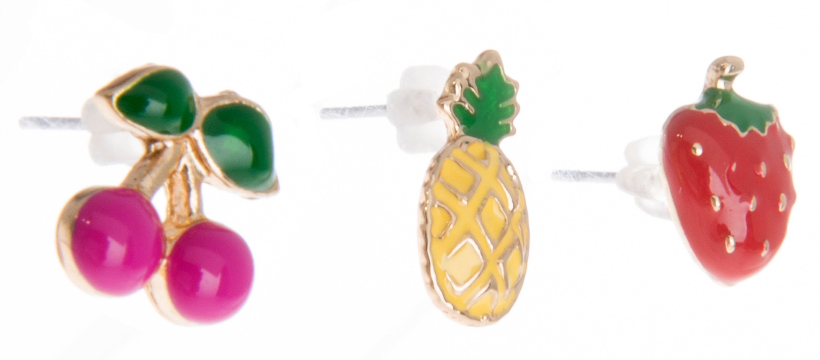 1 gelb-grün lastierter Ohrstecker in Form einer Ananas, 1 rot-grün lasierter Ohrstecker in Form einer Erdbeere und 1 magenta-grün lasierter Ohrstecker in Form von Kirschen