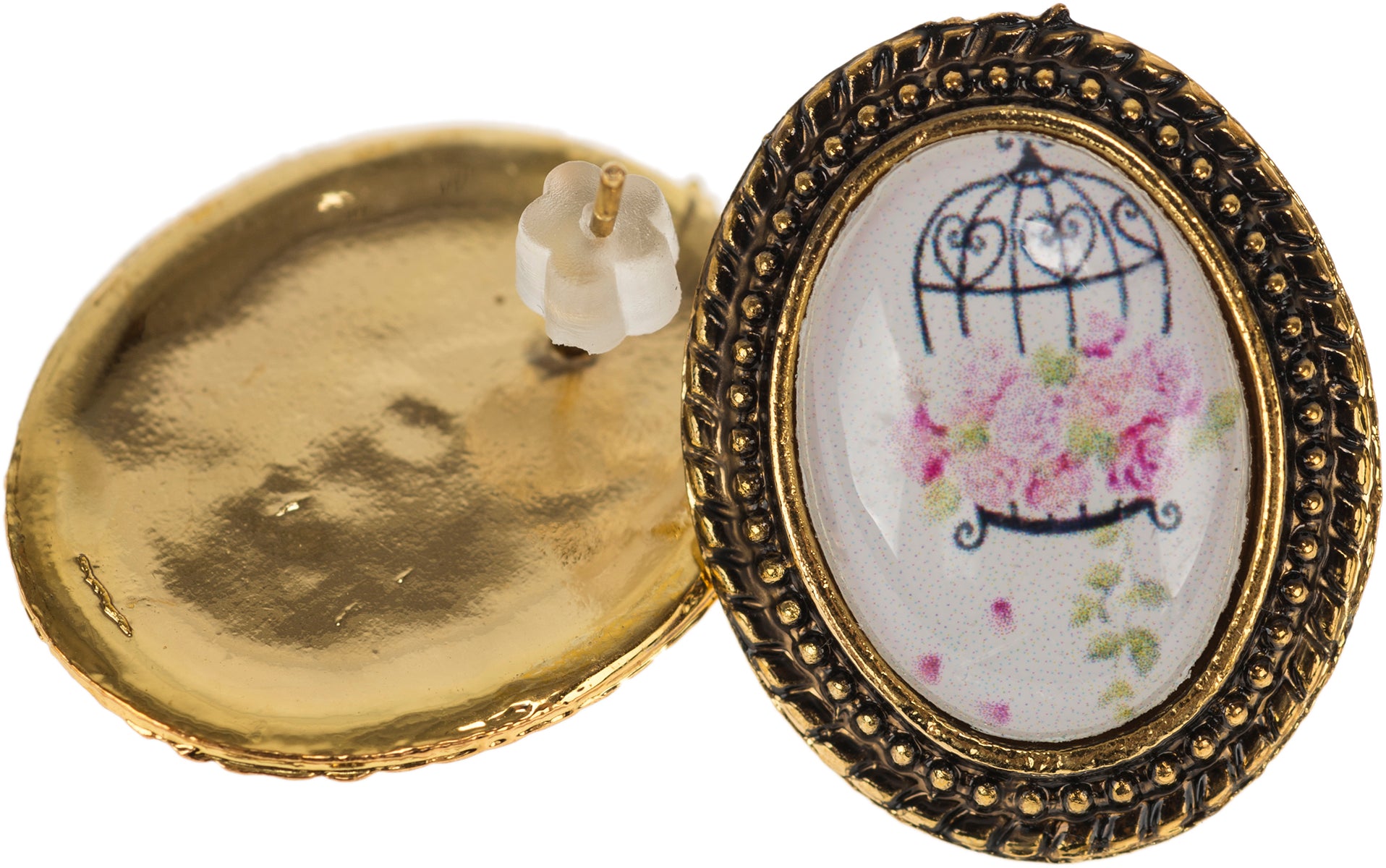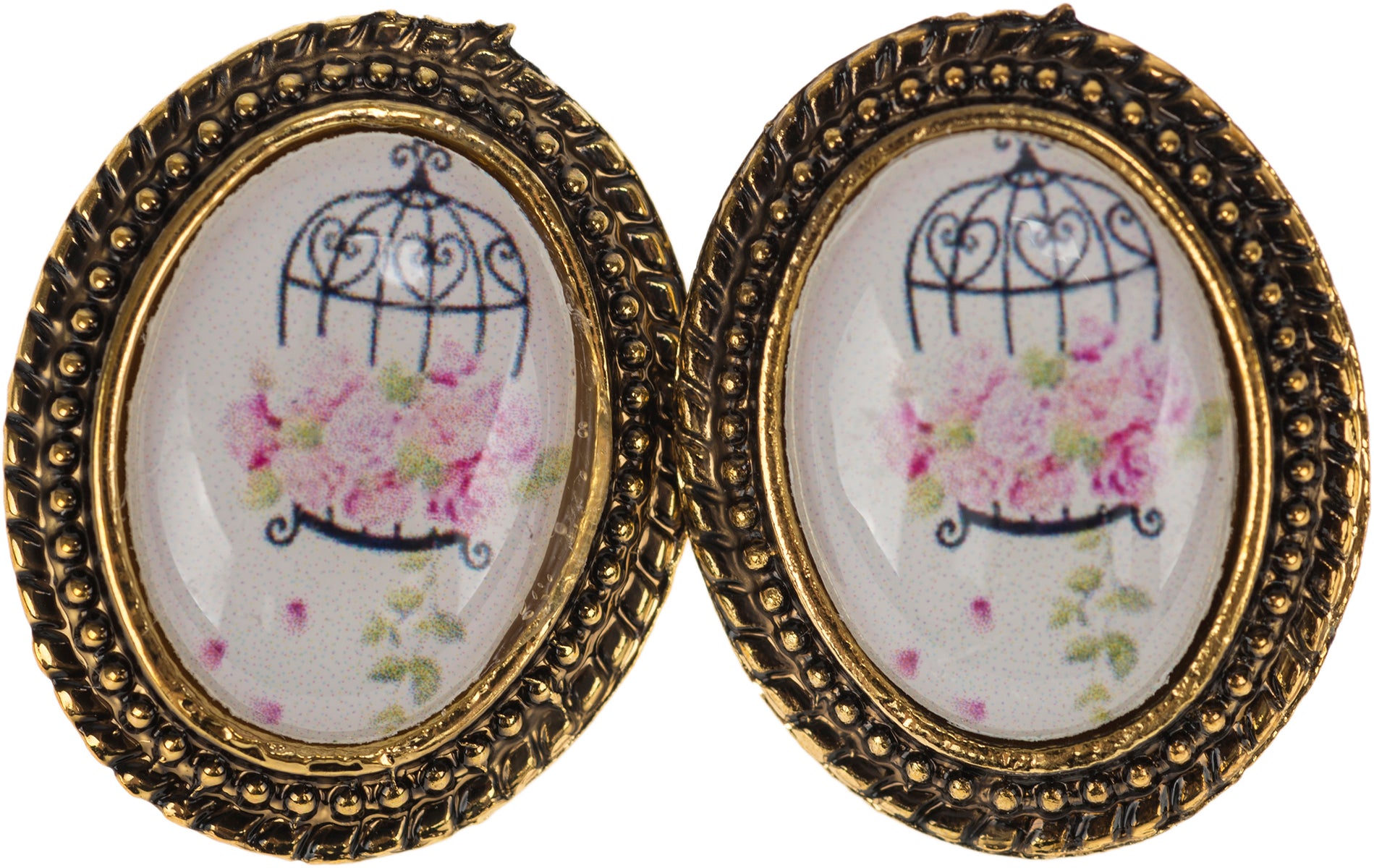 Wunderschöne Vintage Ohrstecker Motiv: Vogelkäfig mit hintergründigen Rosen In edlem Altgold-Rahmen gefasst Ein wunderschönes Accessoire zu allen Retro und Rockabilly Outfits Lieferumfang: 1 Paar