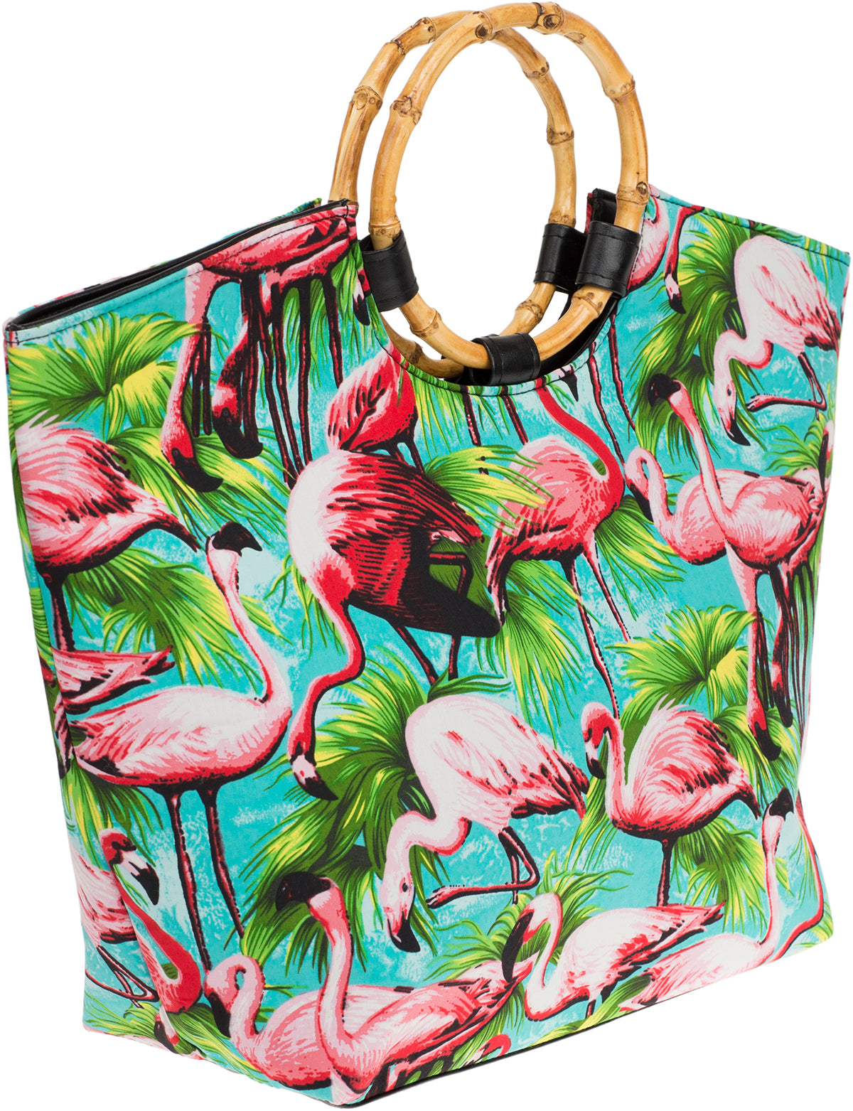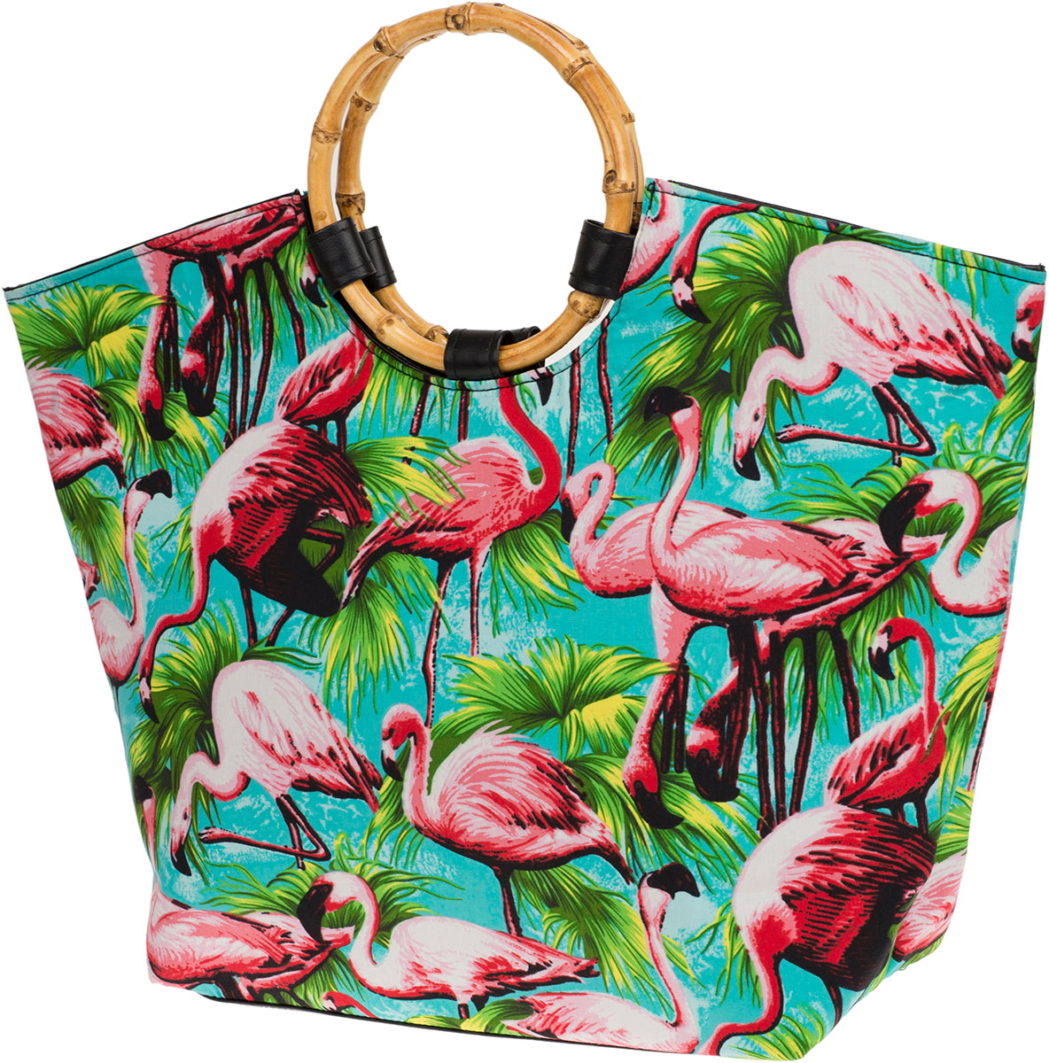 Mit pinken Flamingos, die in hellblauem Wasser stehen, durchsetzt von Palmen