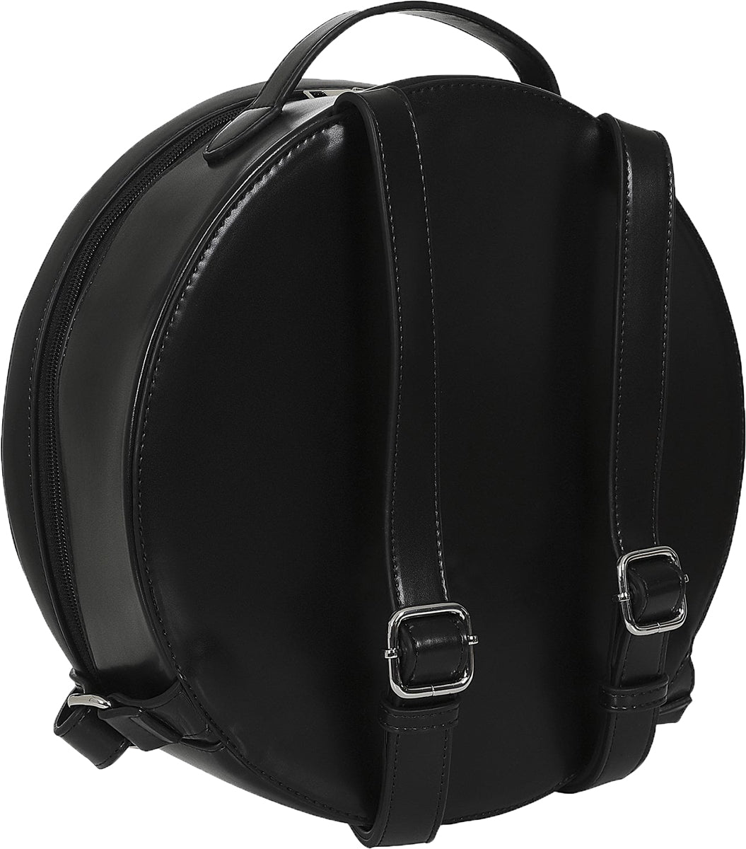 Wunderschöner, runder Rucksack aus schwarzem, matt glänzendem Kunstleder mit viel Stauraum: ein großes Hauptfach mit insgesamt 3 Seitenfächern im Inneren - eines davon mit Reißverschluss