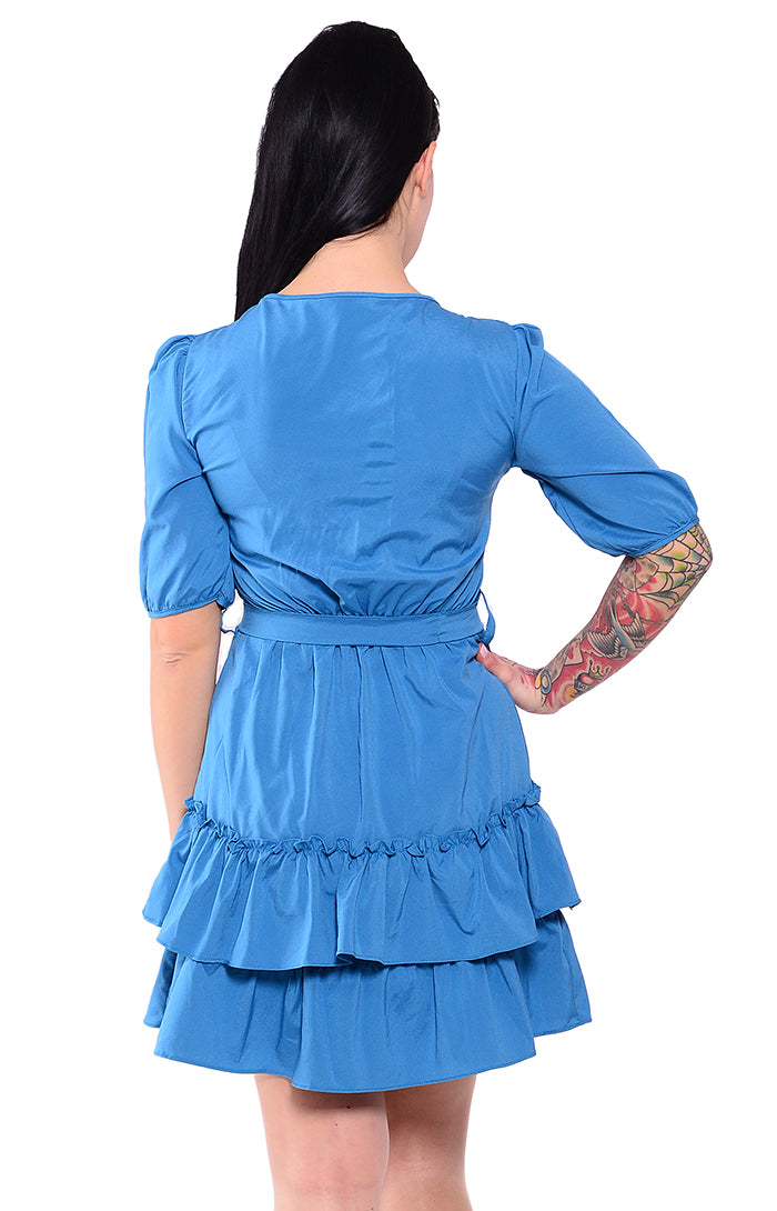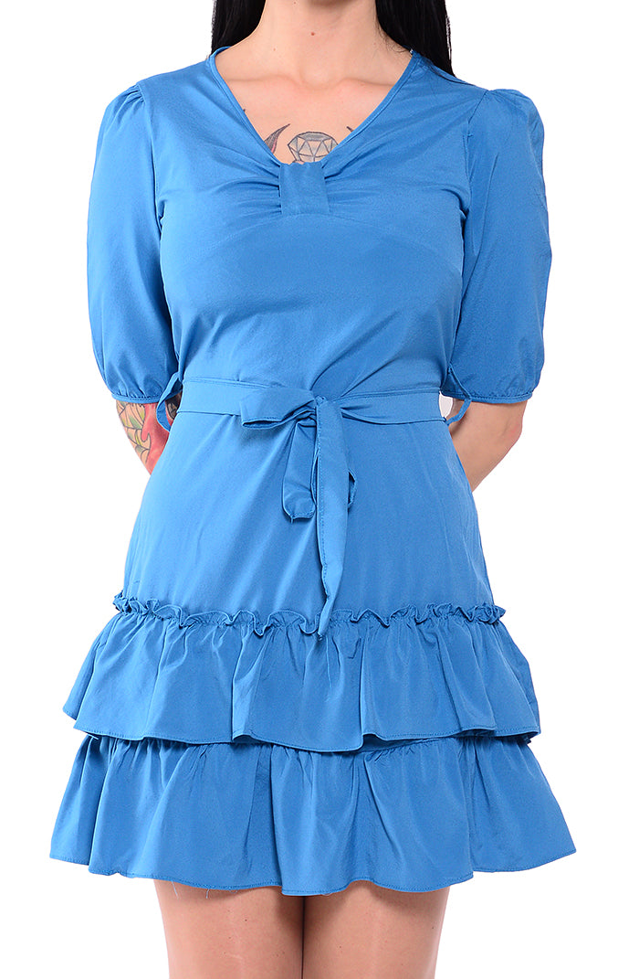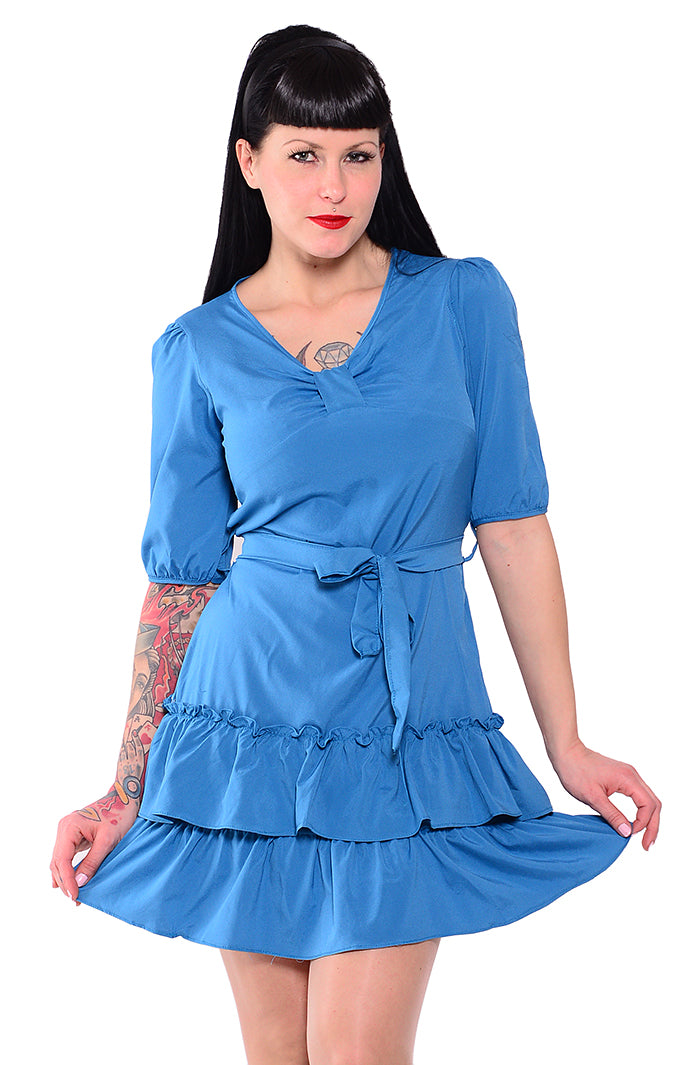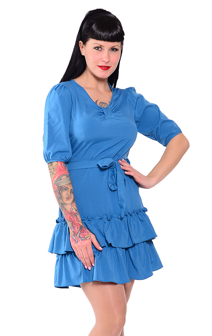 Gesamtlänge ab Schulter gemessen ca. 86cm 3/4 lange Ärmel - Länge ca. 33cm Leichter V-Ausschnitt Mittig am Ausschnitt in Schleifenform Am unteren Rockende mit 2 Rüschenvolants In der Taille mit Stoffgürtel zu binden Tailliert geschnitten