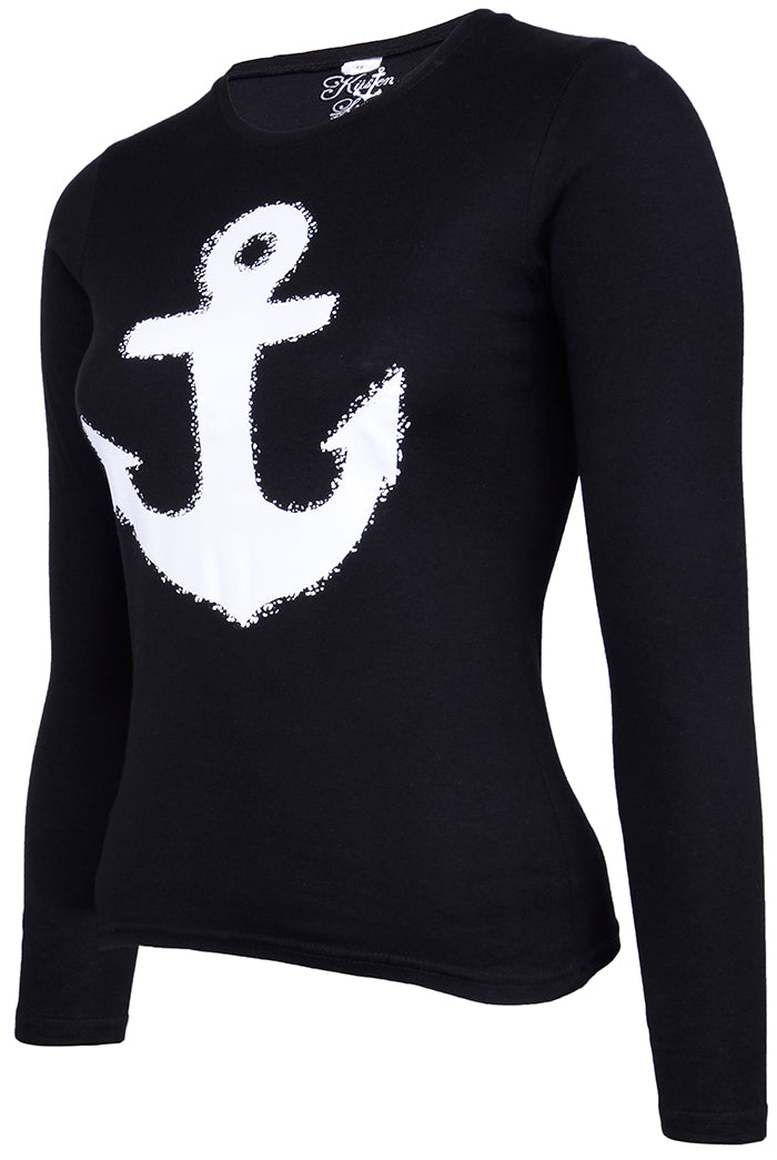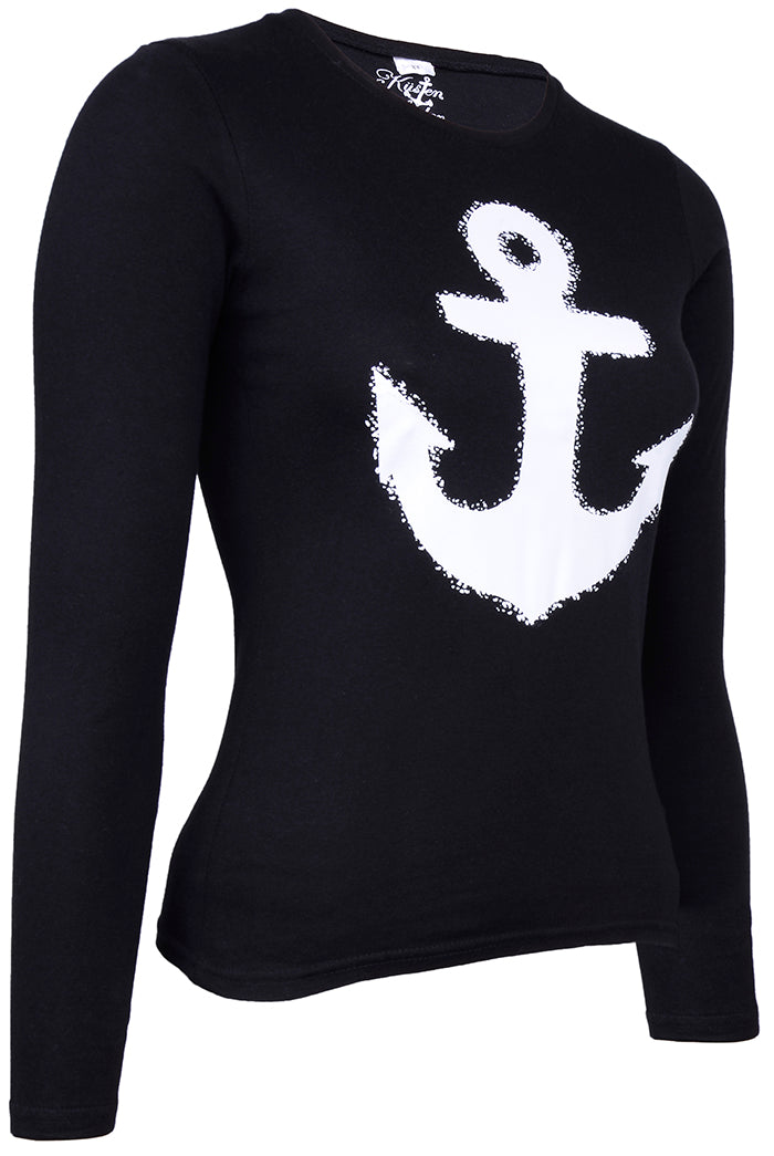 Girlie langarm T- Shirt Weiter Rundhalsausschnitt mit Rippstrickbündchen Doppelnaht an Ärmelabschluss und Bund Stretchig und figurnah geschnitten Anker Motiv auf der Vorderseite