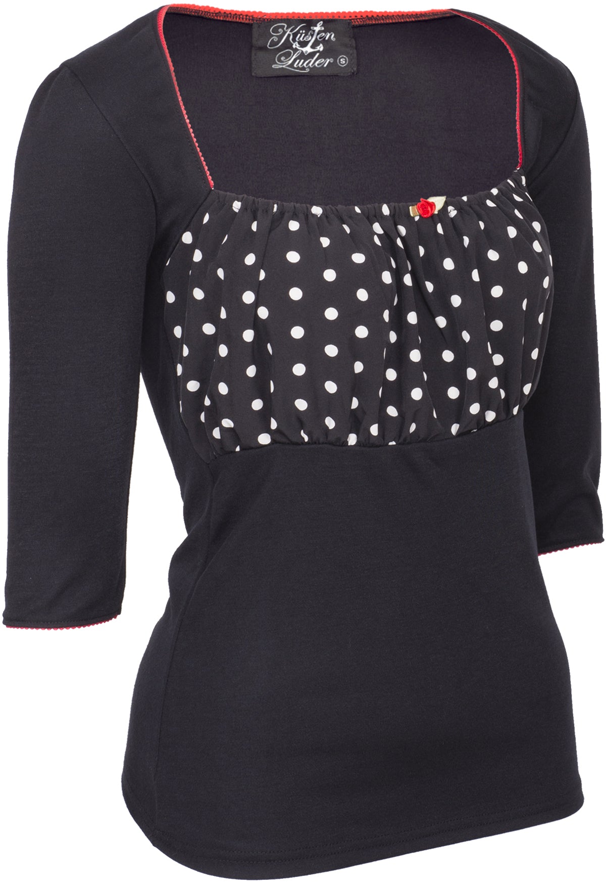 Eckiger Ausschnitt, mit roter Mausezahnspitze besetzt