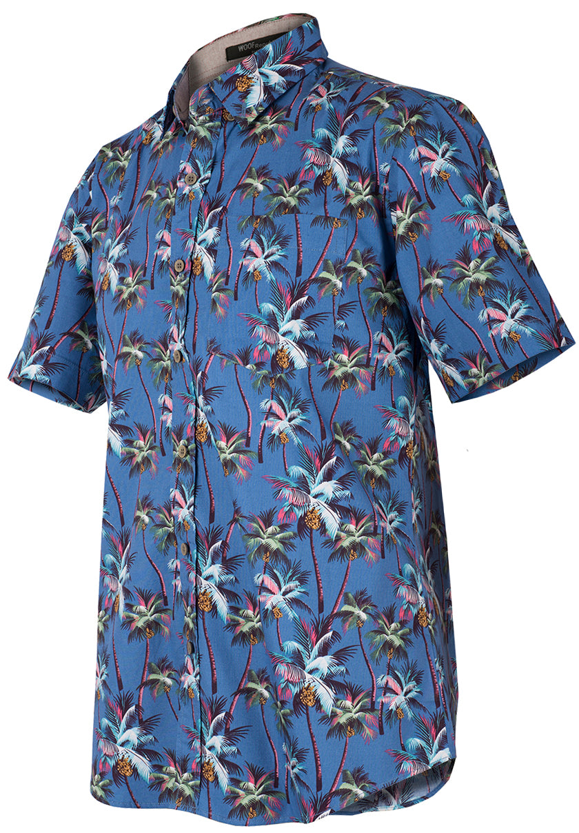 Jeansblaues Retro Hawaiihemd mit mehrfarbigen Palmen als Muster
