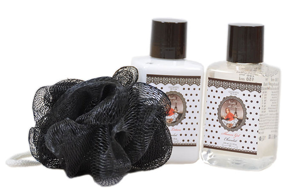 Duschgel (150ml), Body Lotion (150ml) und Netzschwamm